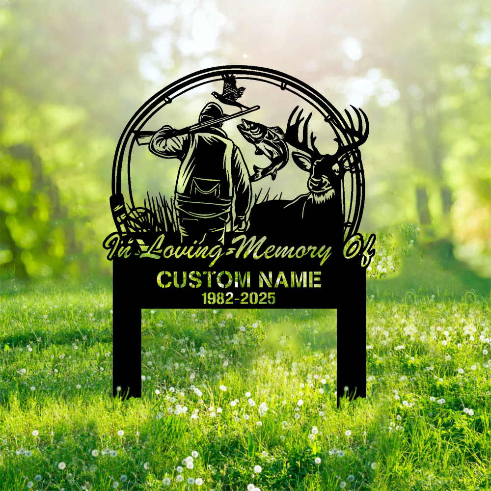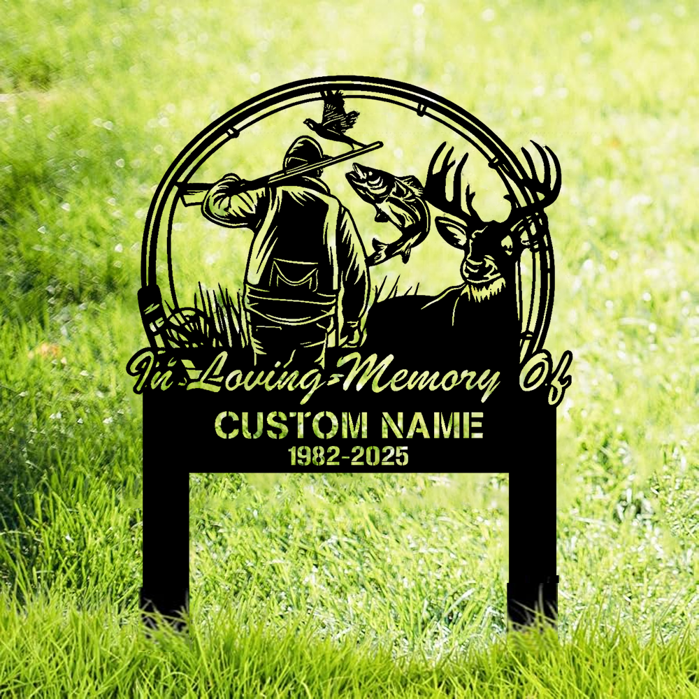 Personalized Hunter Memorial Metal Sign – In Loving Memory Grave Marker with Deer, Fish & Duck Design for Yard & Garden Decor