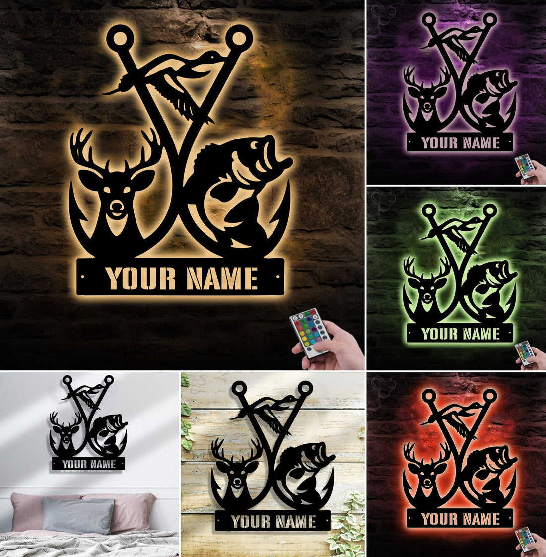 Personalized Hunting Fishing Metal Sign WITH LED/WITHOUT LED, Deer Duck Bass Wall Decor, Rustic Outdoor Gift for Hunters and Anglers