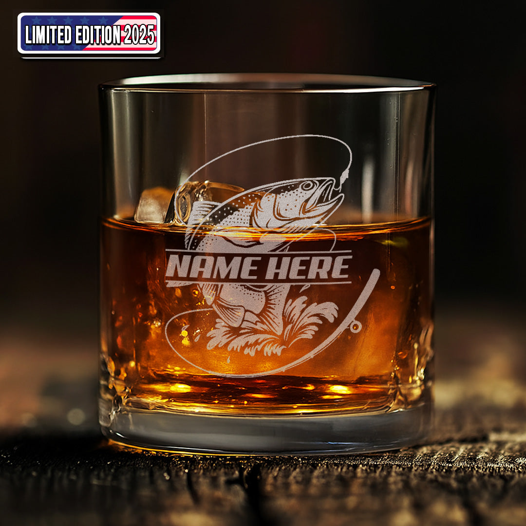 Custom Name Trout Fishing Whiskey Glass – Personalized Engraved Fly Fisherman Gift