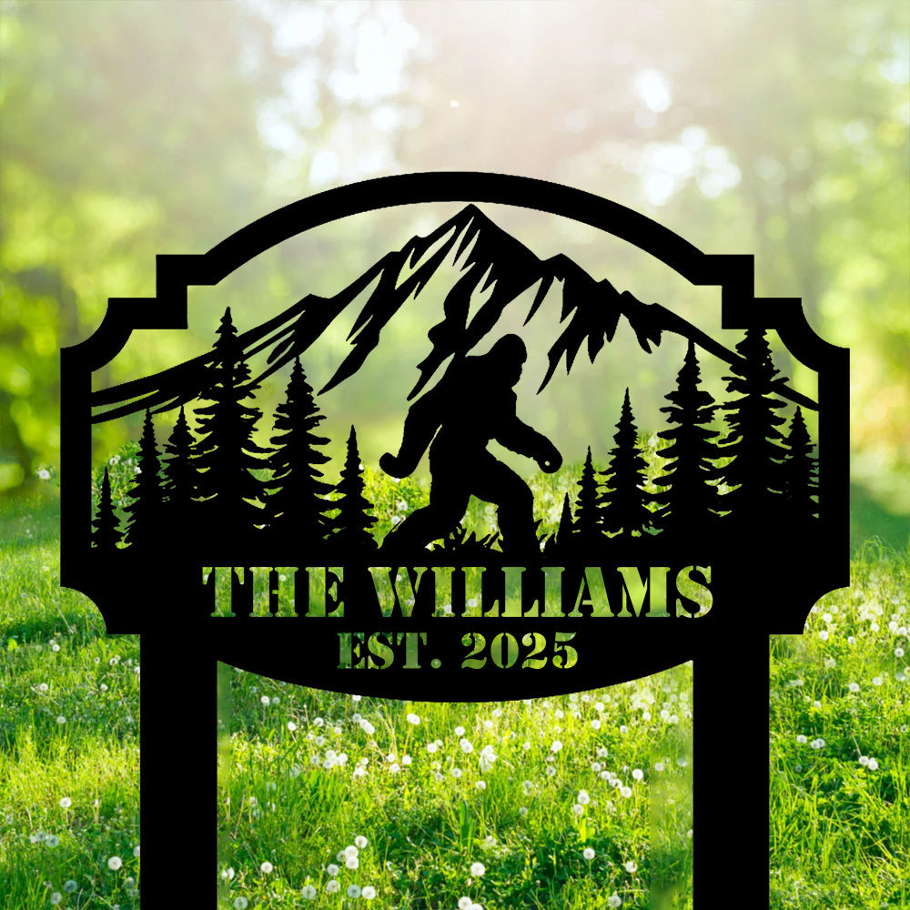 Personalized Bigfoot Mountain Scene Metal Sign – Custom Family Yard Sign for Cabin & Outdoor Decor
