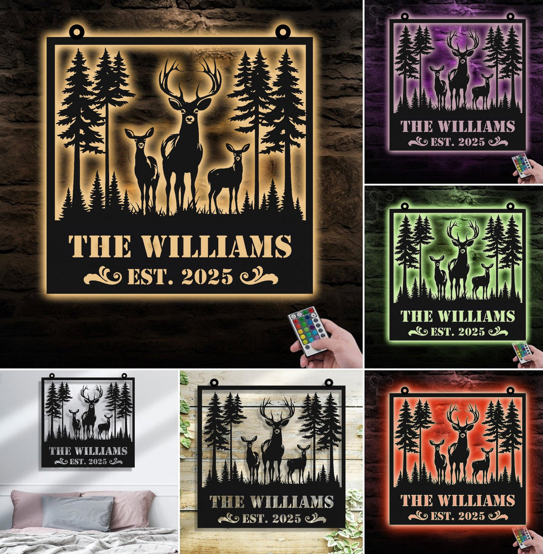 Personalized Deer Family Metal Sign WITH LED/WITHOUT LED - Rustic Cabin Name Sign, Mountain Wildlife Wall Art for Lodge & Outdoor Decor
