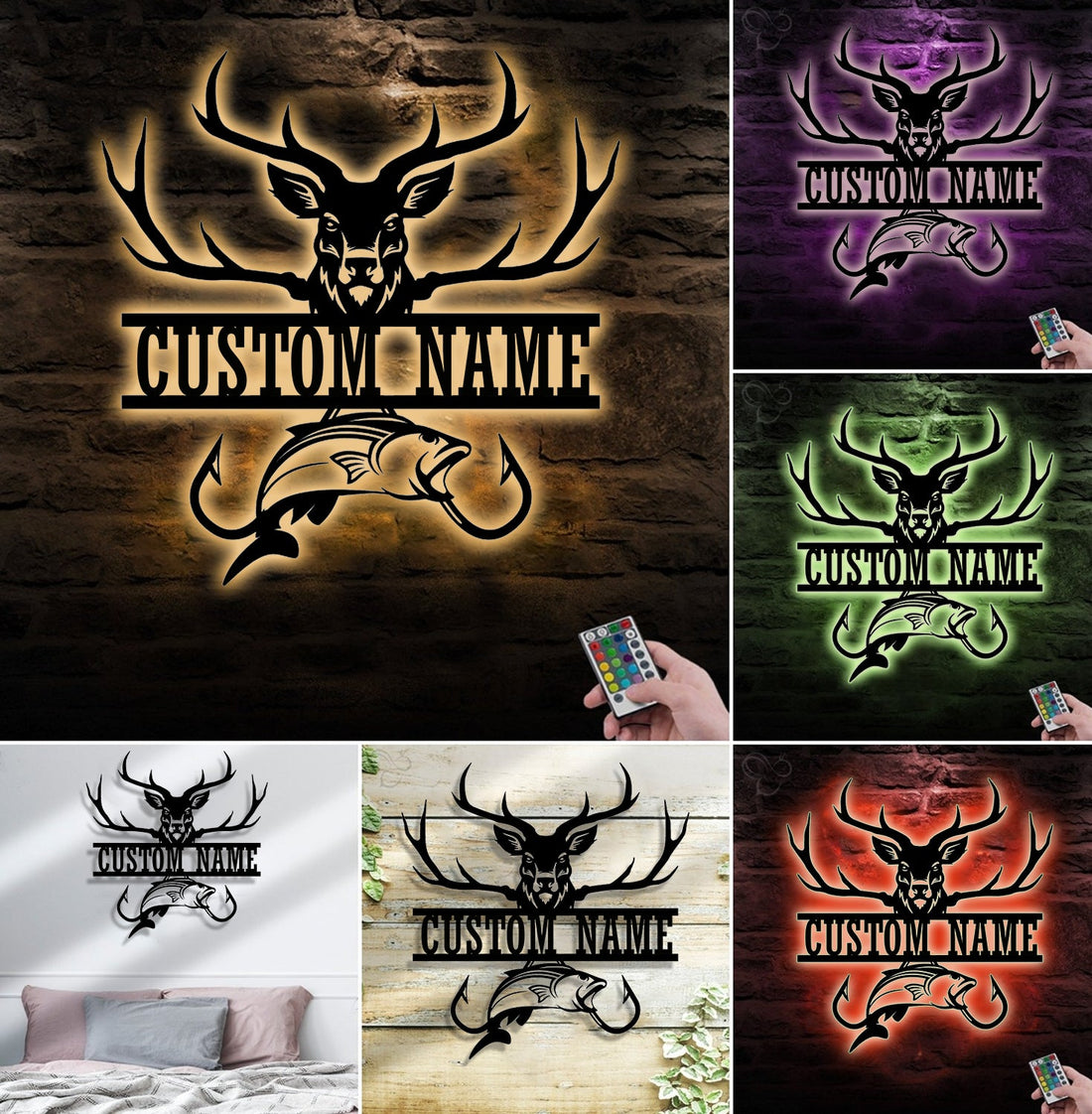 Personalized Deer & Fish Metal Sign WITH LED/WITHOUT LED Light Rustic Cabin Wall Decor Hunter Fisher Gift