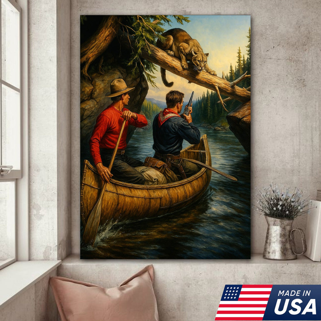 Vintage Wilderness Canoe Adventure Wall Art – Hunters Confront Mountain Lion Rustic Cabin Decor