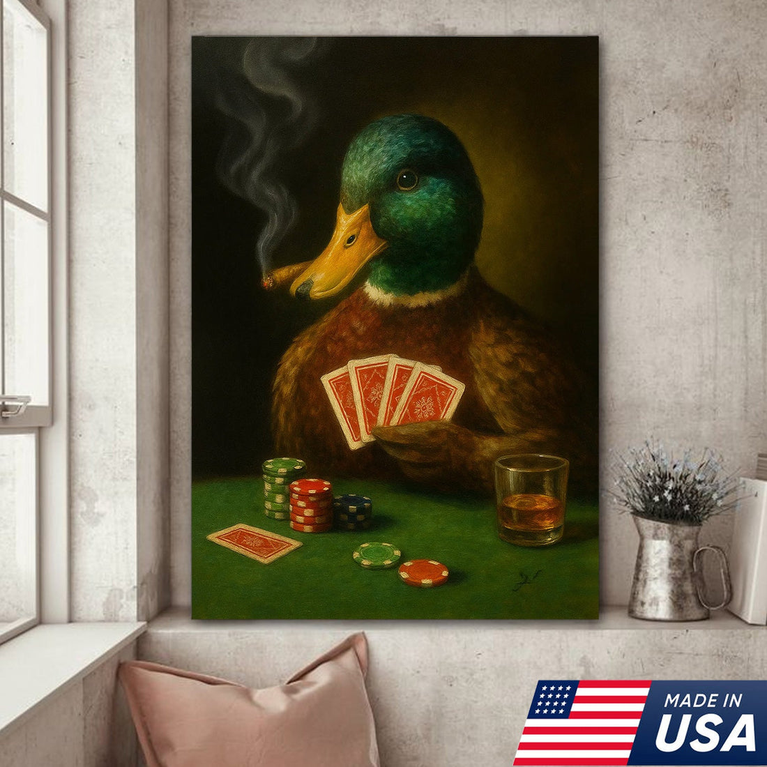 Funny Mallard Duck Canvas Wall Art, Rustic Poker Animal Portrait Playing Cards, Vintage Anthropomorphic Print for Man Cave Decor