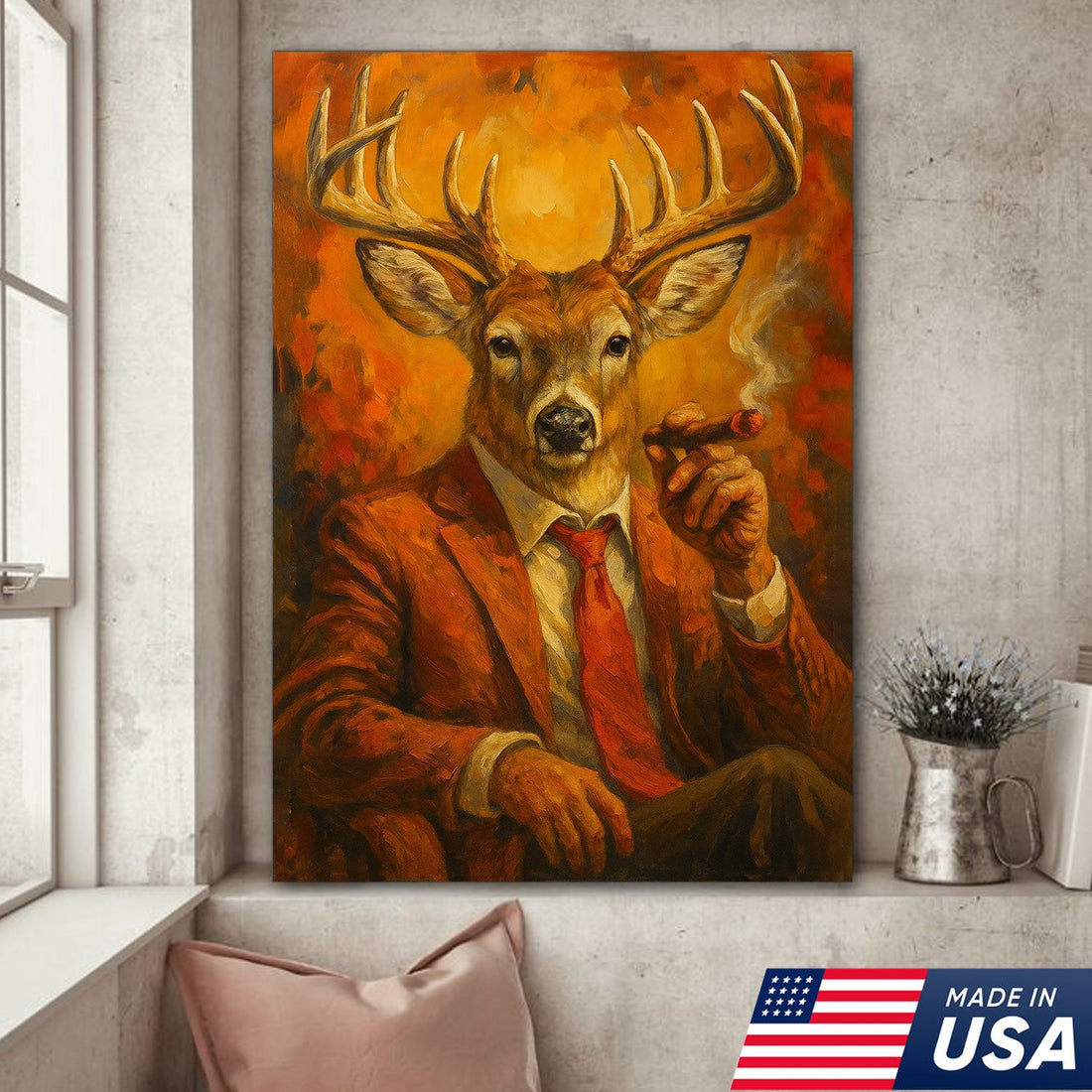 Deer Smoking Canvas, Buck Wall Art Print in Suit for Man Cave, Rustic Hunting Cabin & Smoking Lounge
