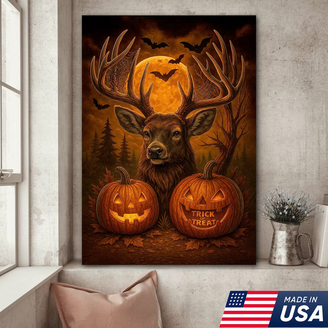 Trophy Buck Halloween Canvas Wall Art – Spooky Deer with Pumpkins and Full Moon Decor