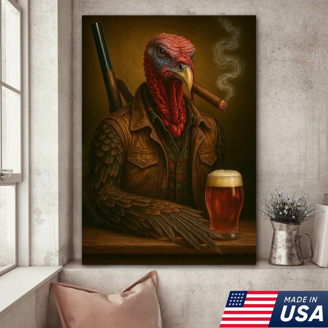 Wild Turkey Canvas Wall Art – Surreal Hunter Portrait with Beer Glass, Rustic Lodge Decor