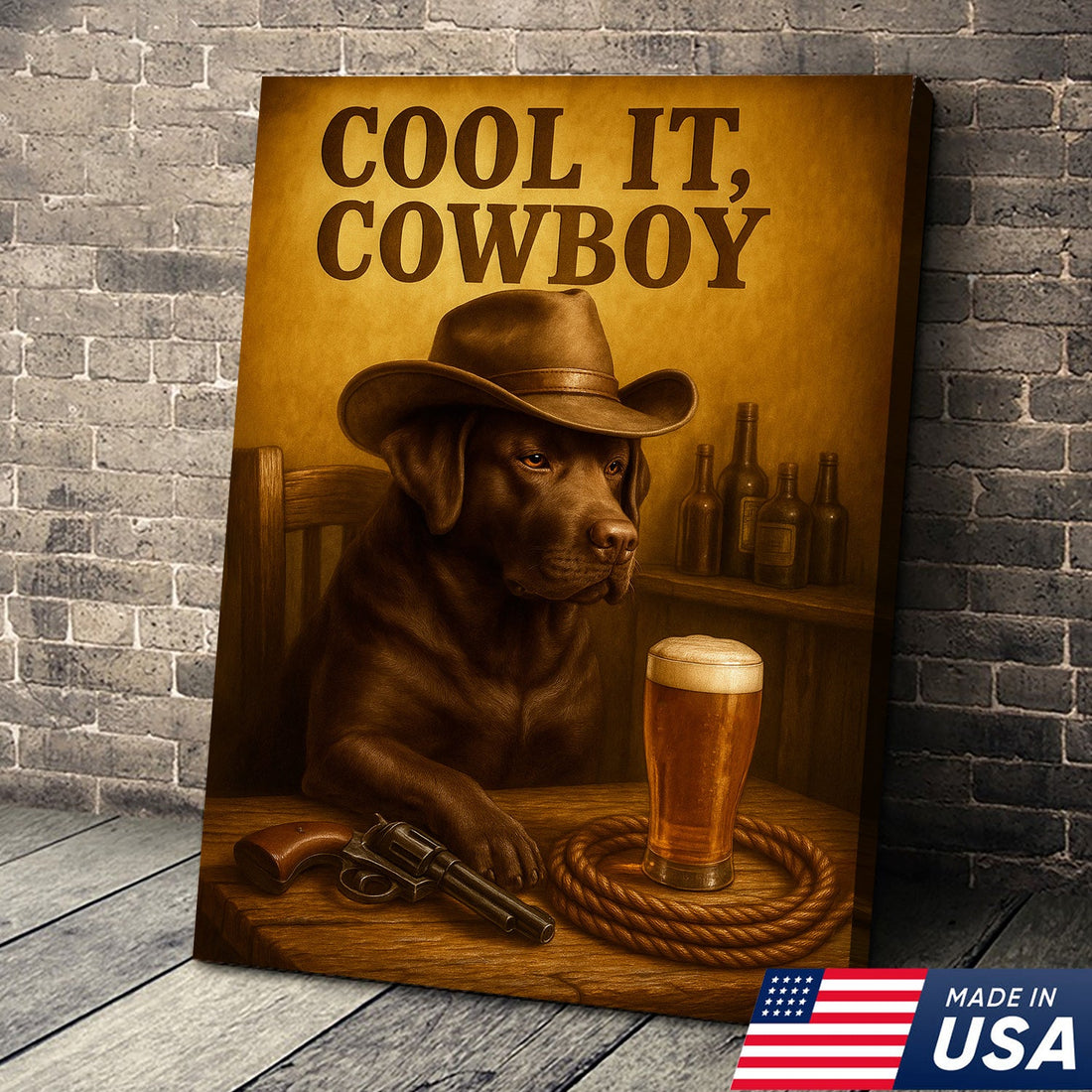 Funny Cowboy Labrador Dog Canvas Wall Art – Rustic Beer Bar Decor Gift for Hunters, Lodge and Cabin
