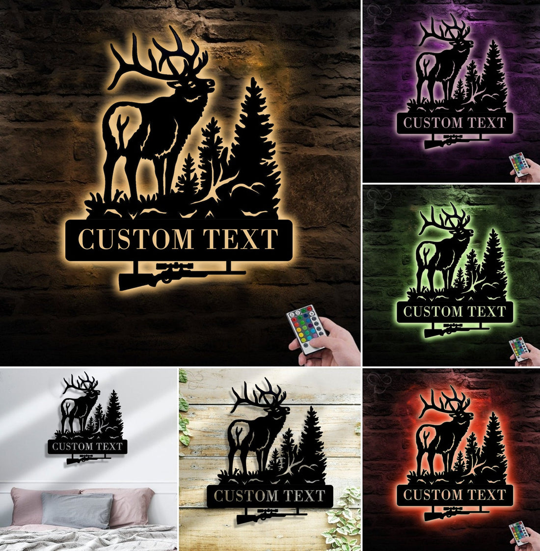 Personalized Elk Hunting Metal Sign WITH LED/WITHOUT LED Light Deer Forest Scene Custom Name Rifle Wall Art Hunter Gift