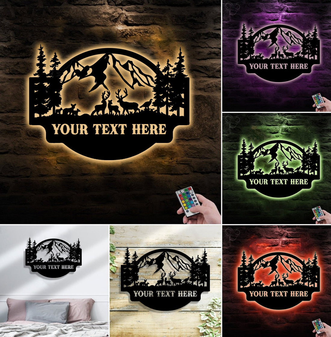 Personalized Deer Hunting Metal Sign WITH LED/WITHOUT LED Light Mountain Scene Custom Text Rustic Wall Art Gift