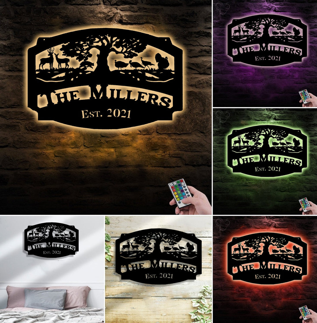 Personalized Deer Family Metal Sign WITH LED/WITHOUT LED - Rustic Cabin Name Sign, Mountain Wildlife Wall Art for Lodge & Outdoor Decor