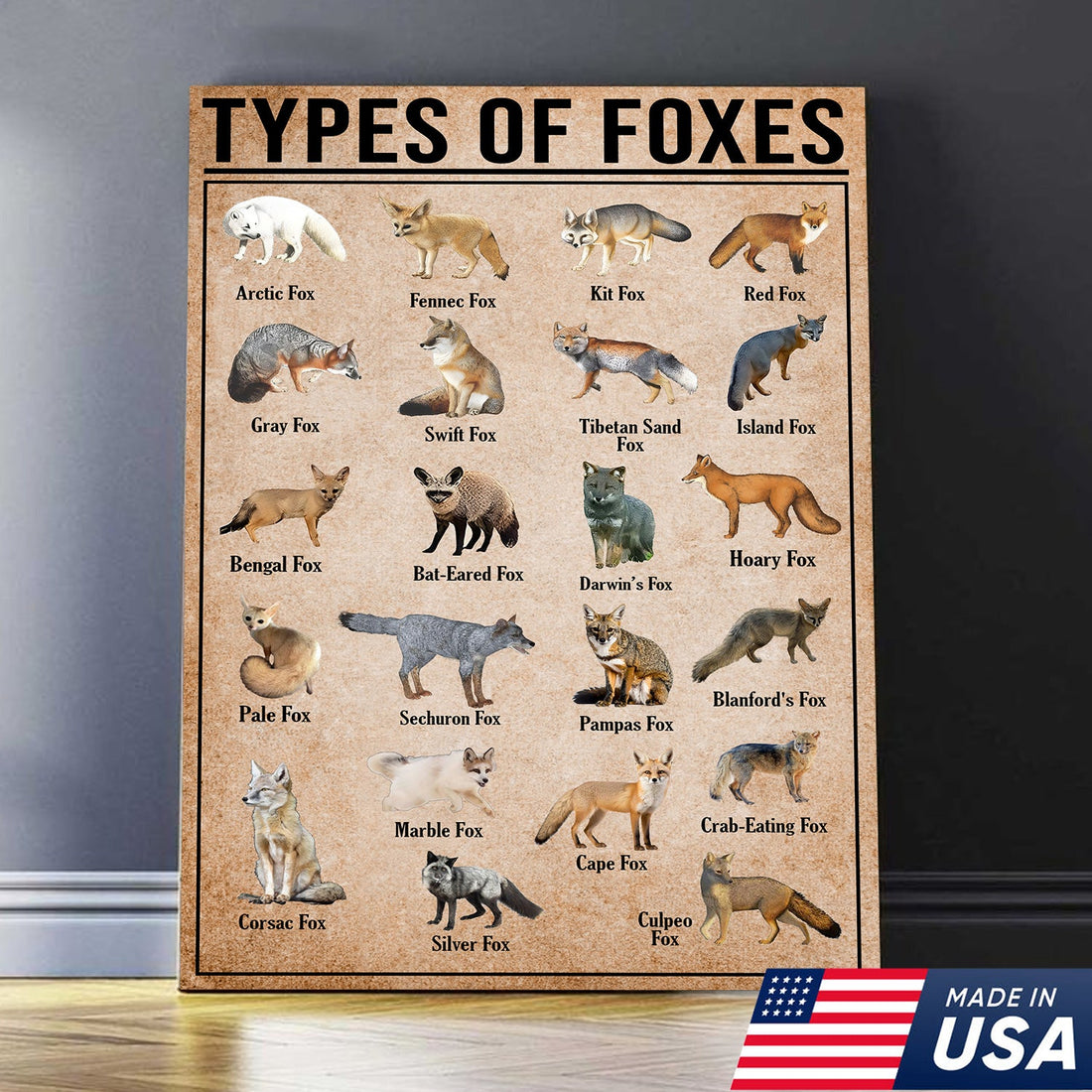 Types Of Foxes Species Wall Art Canvas - Wildlife Educational Canvas - Hunting Lodge Decoration