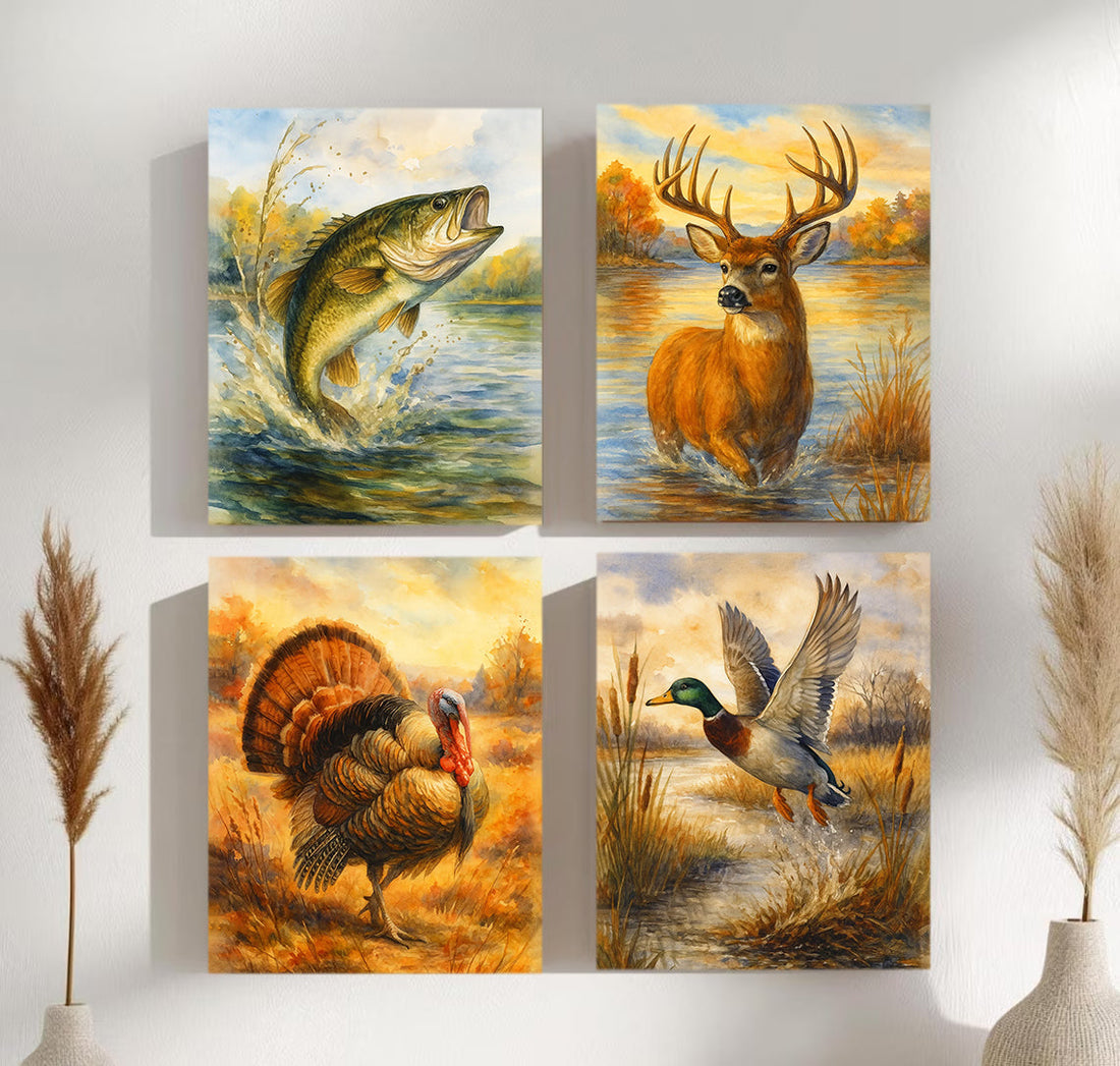 Set of 4 Hunting & Wildlife Canvas Wall Art – Bass, Deer, Turkey & Mallard – Rustic Cabin Lodge Décor