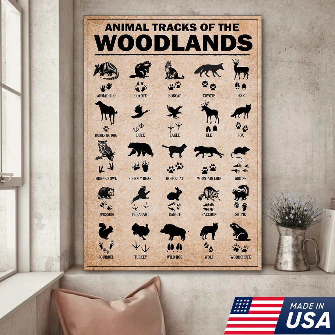 Animal Tracks of the Woodlands Canvas Wall Art, Wildlife Footprint Chart, Rustic Hunting Cabin & Educational Decor