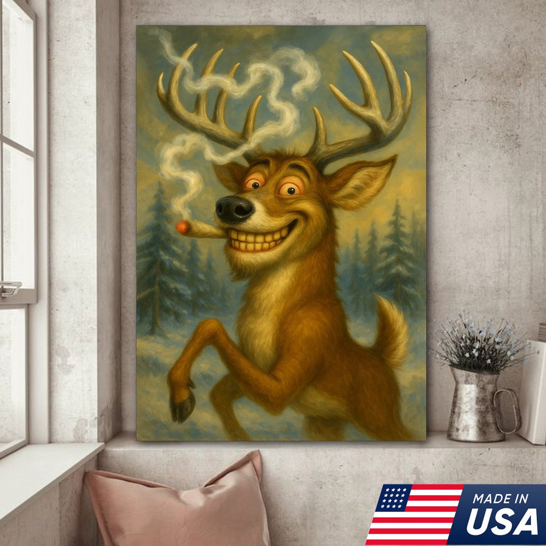 Funny Deer Smoking Canvas Wall Art – Rustic Cabin Lodge Decor, Hunting Gift for Men