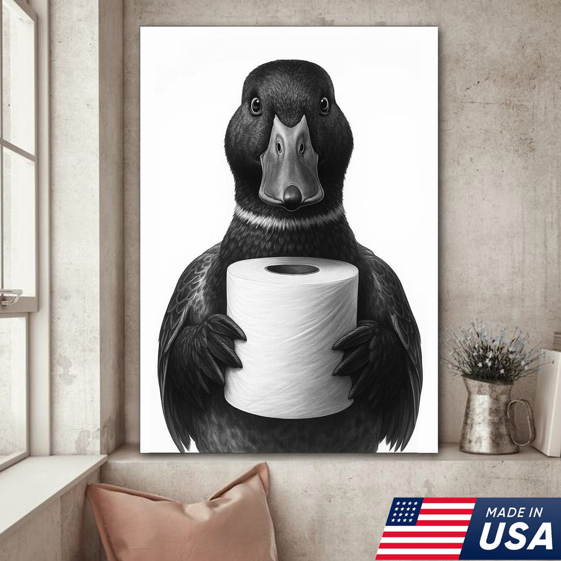 Mallard Duck Canvas Wall Art, Funny Animal Portrait Holding Toilet Paper, Black and White Bathroom Decor Print