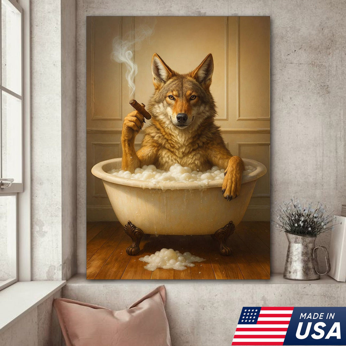 Wolf Coyote Canvas Wall Art, Funny Animal Portrait in Bubble Bath, Vintage Rustic Bathroom Decor Print