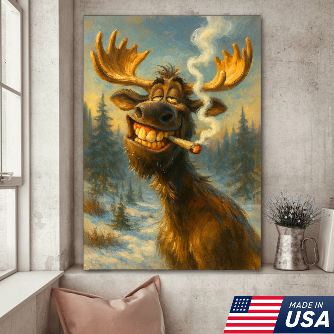 Funny Moose Smoking Canvas Wall Art – Rustic Cabin Lodge Decor