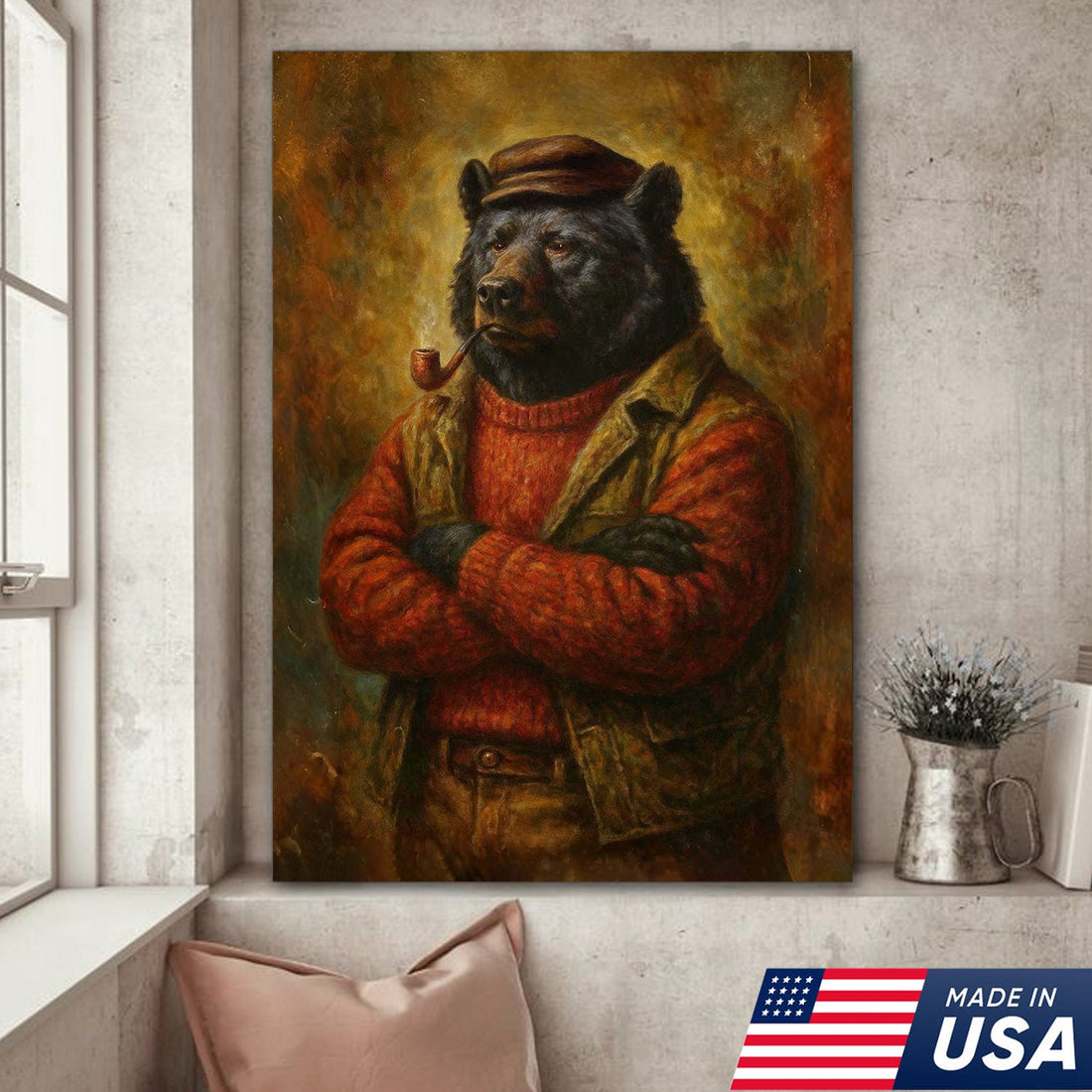 Vintage Black Bear Wall Art – Rustic Canvas Print of Bear in Red Sweater Smoking Pipe - Animal Portrait Home Decor