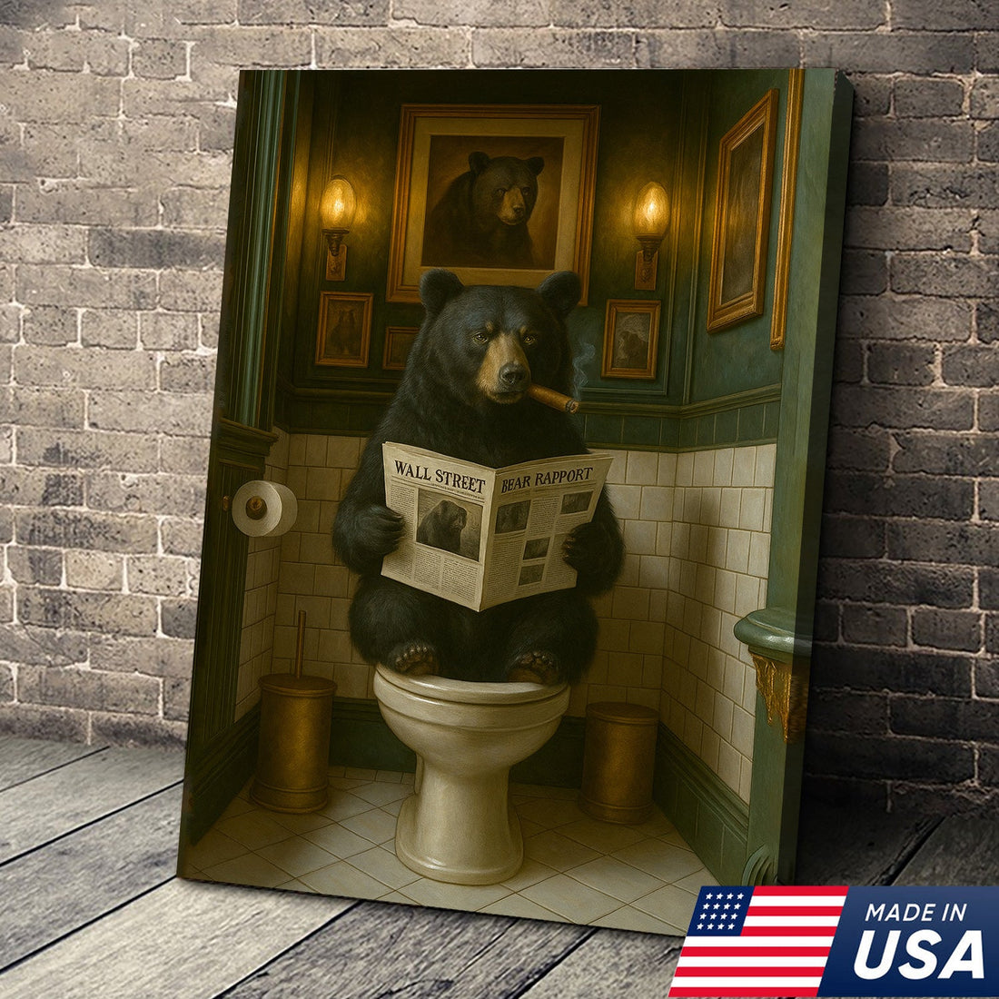 Funny Bear Bathroom Canvas – Toilet Humor Animal Wall Art Gift for Hunters, Rustic Cabin, Man Cave Decor