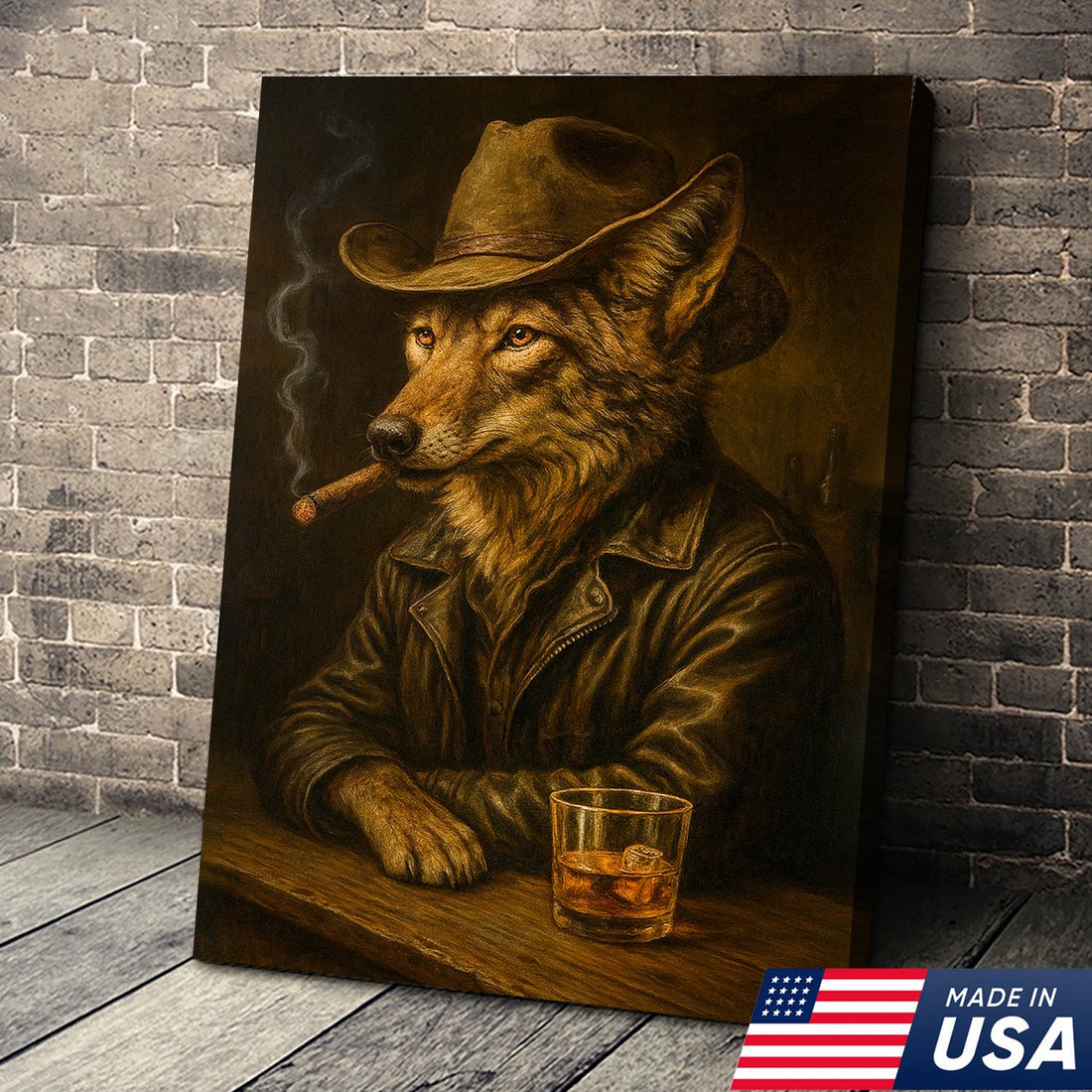 Western Wolf Canvas Wall Art – Cowboy Smoking Whiskey Print for Hunters, Rustic Cabin, and Country Decor