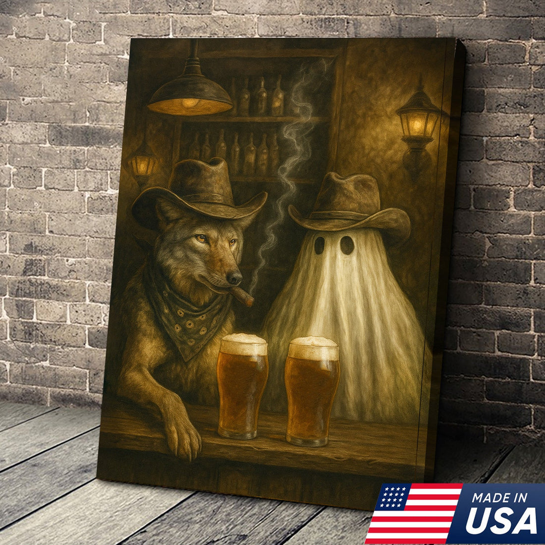 Cowboy Wolf & Ghost Canvas – Rustic Western Bar Wall Art for Halloween, Lodge, Cabin, and Man Cave