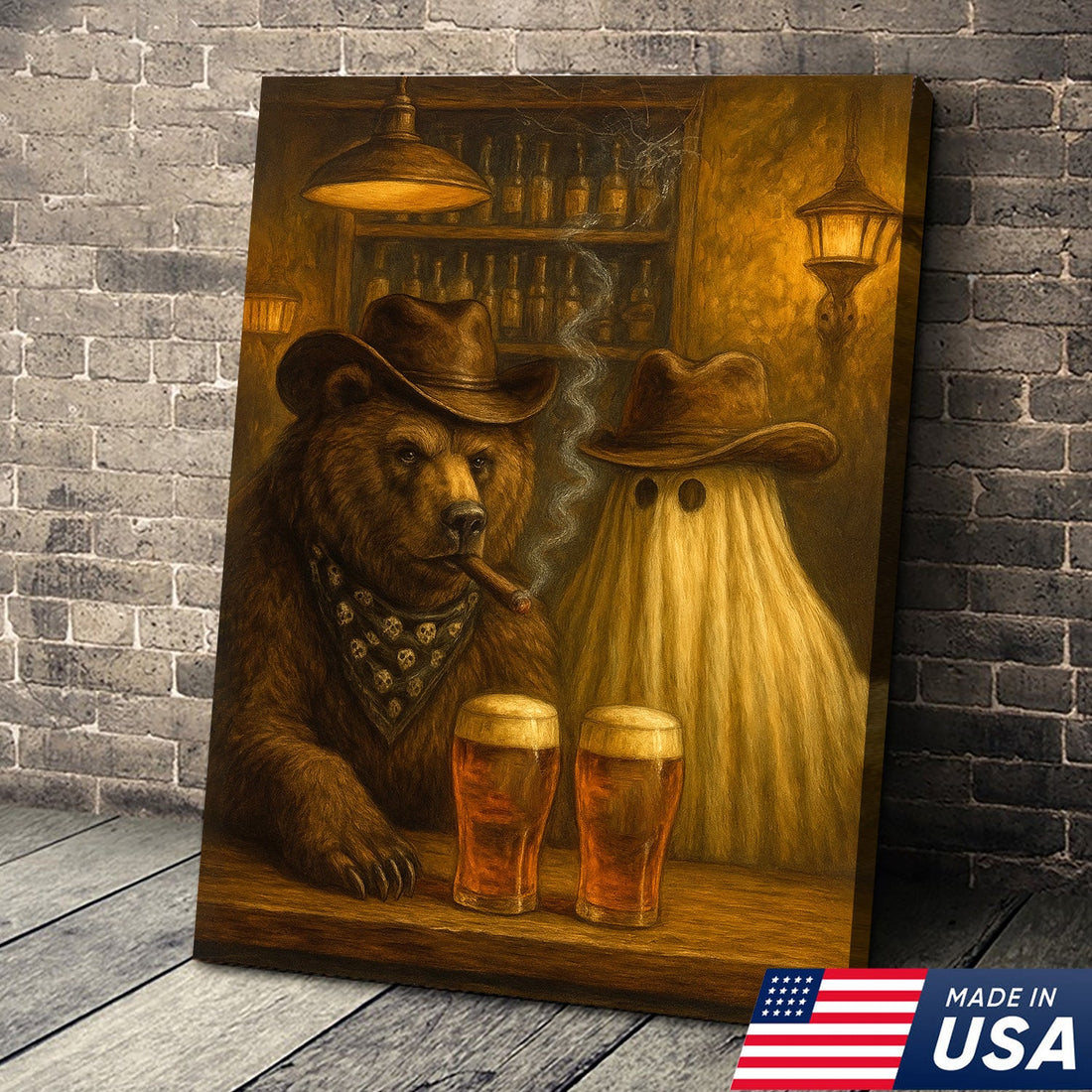 Halloween Bar Bear Canvas – Funny Rustic Cowboy Ghost Wall Art for Cabin, Hunters and Man Cave