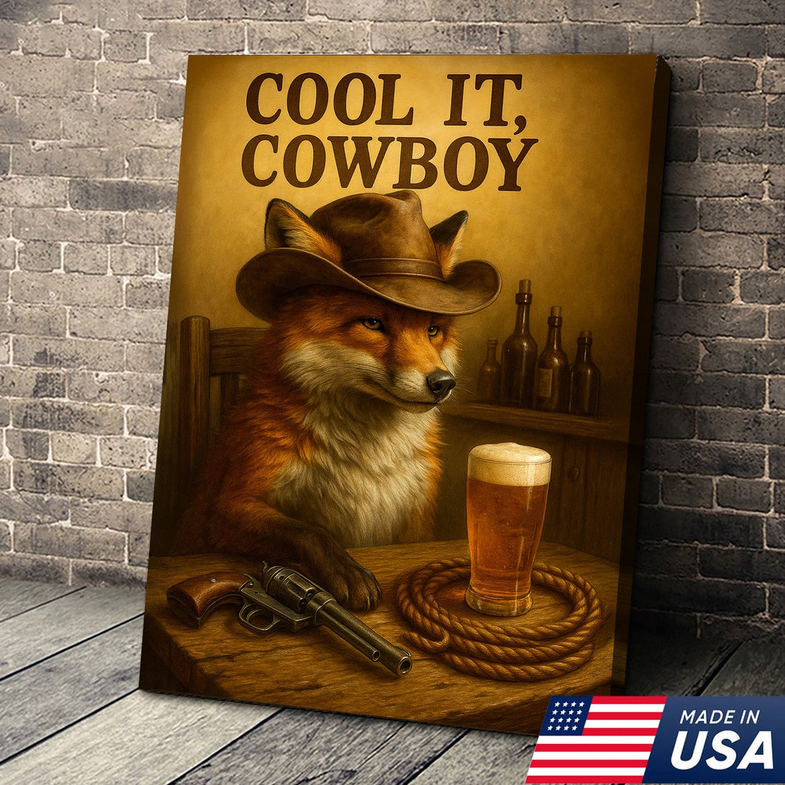 Cowboy Fox Canvas Wall Art – Rustic Western Saloon Painting with Coors Beer for Cabin and Man Cave