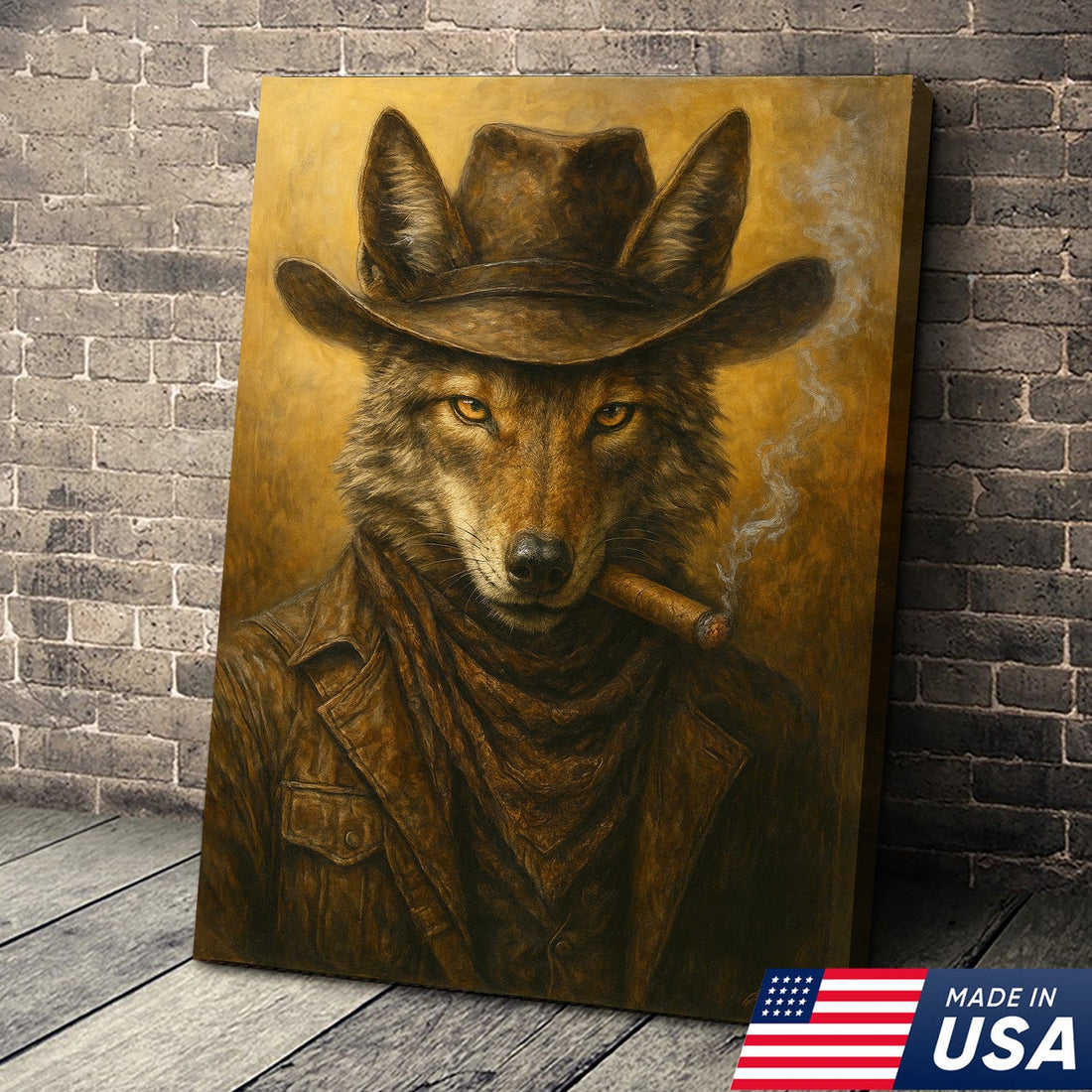 Coyote Cowboy Canvas Wall Art – Rustic Western Outlaw Painting for Lodge, Bar, Hunters, and Man Cave