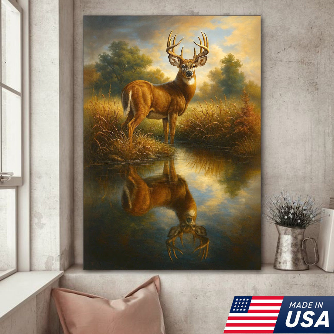 Majestic Deer Reflection Canvas Wall Art – Rustic Wildlife Nature Scene – Cabin and Lodge Decor