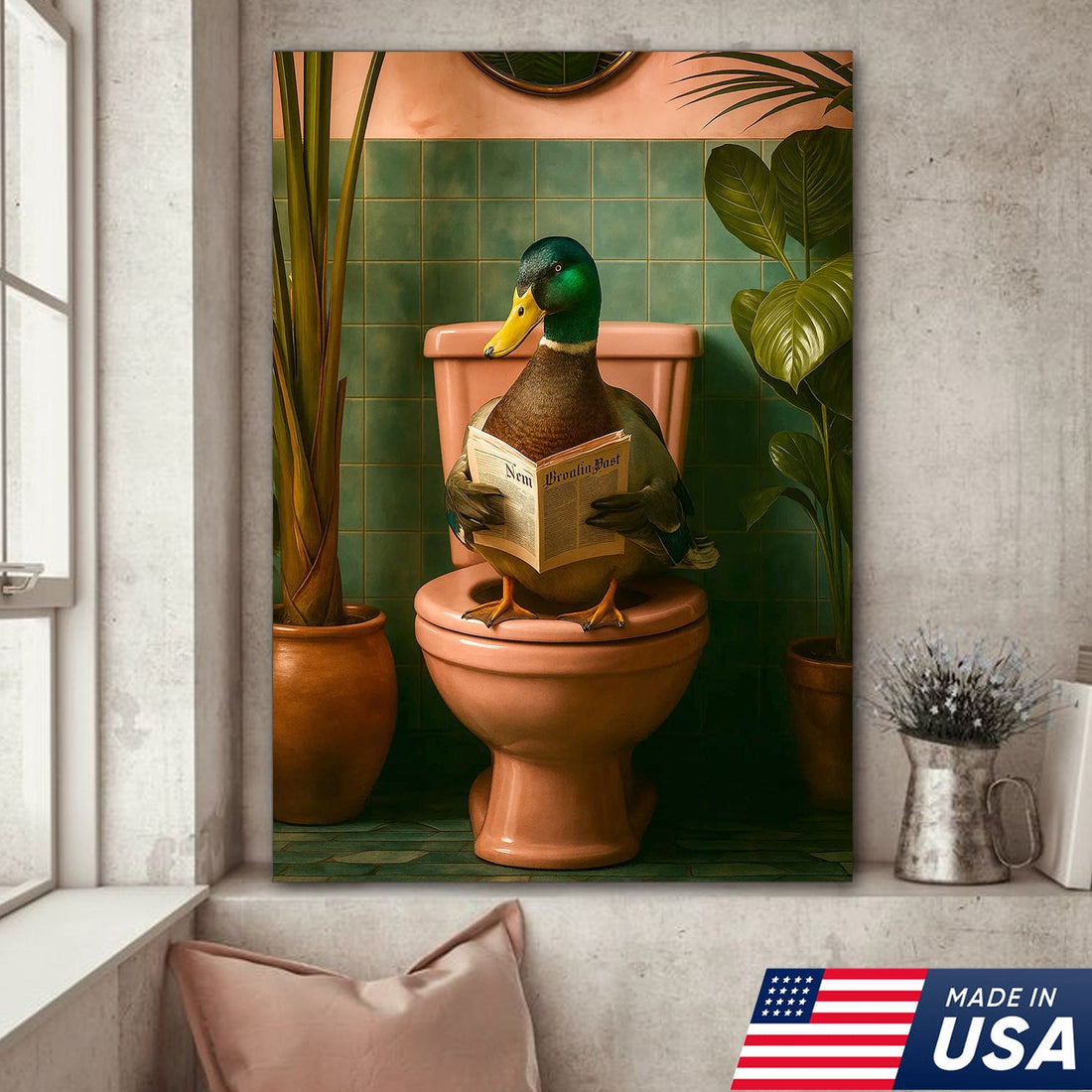 Whimsical Duck Bathroom Canvas Wall Art – Funny Rustic Lodge Decor – Mallard Reading Humor Print