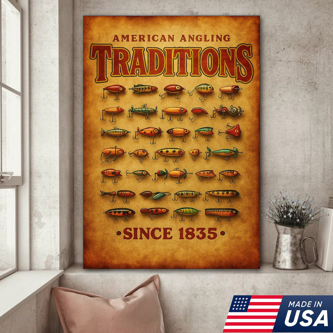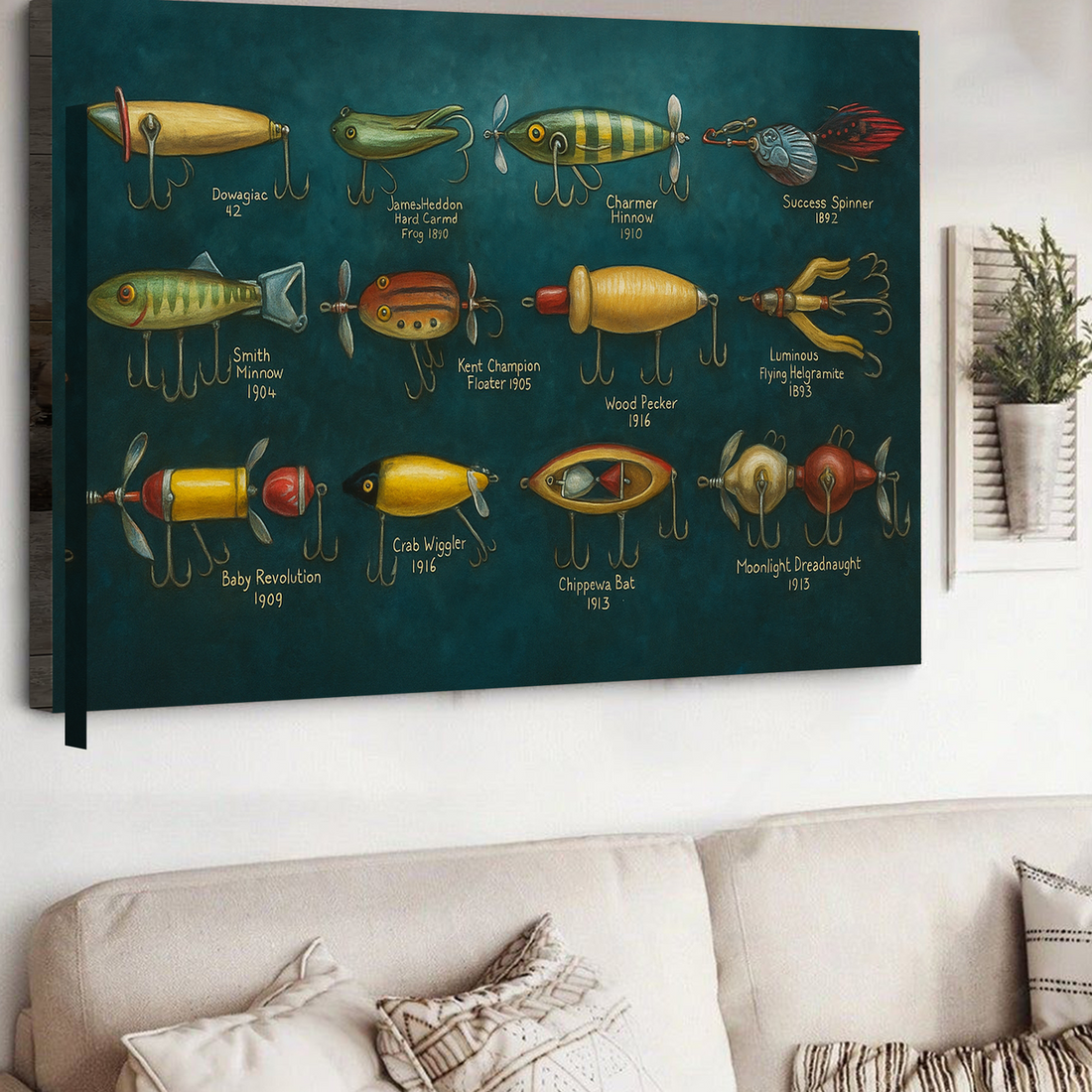 Vintage Fishing Lures Canvas Wall Art – Rustic Angling Lodge Decor Gift for Fishermen & Collectors