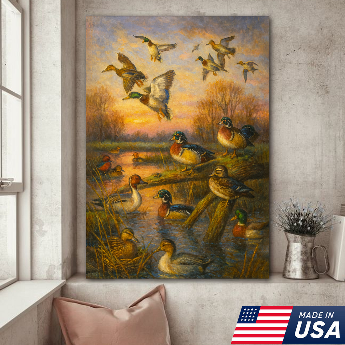 Duck Hunting Canvas Wall Art – Oil Painting Style Waterfowl at Sunset Rustic Lodge Decor