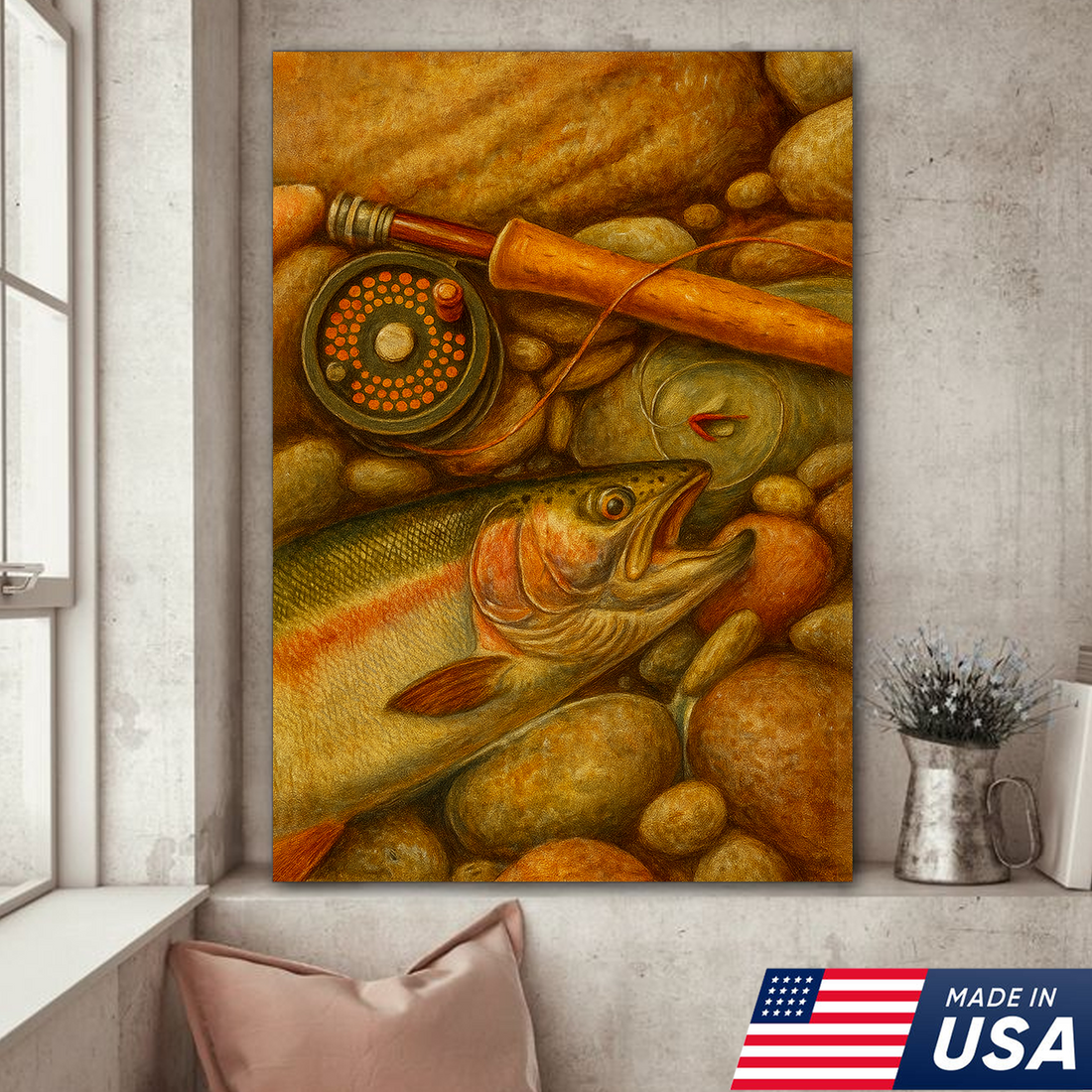 ly Fishing Canvas Wall Art – Retro Trout Painting with Rod & Reel Rustic Cabin Lodge Decor
