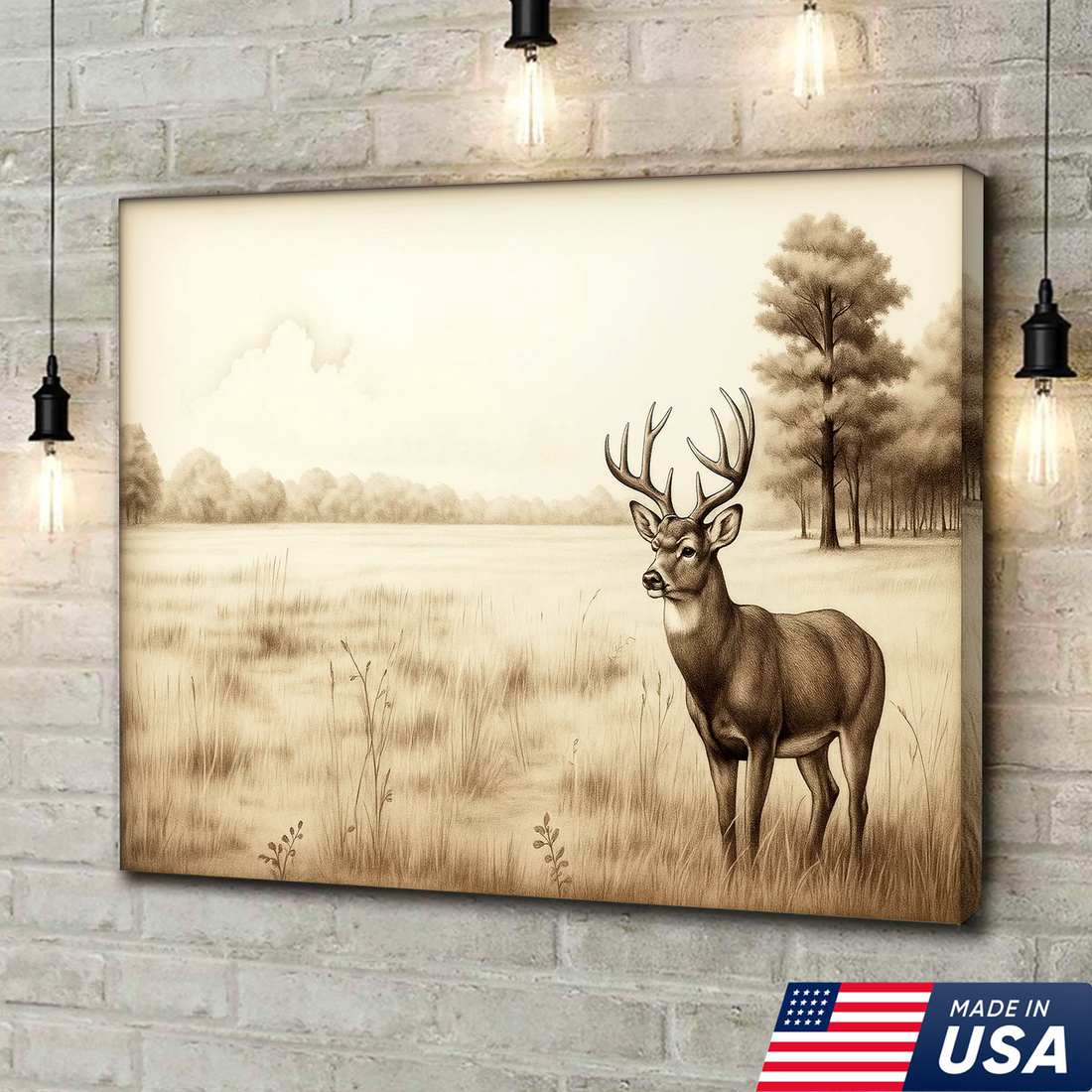 Whitetail Deer Canvas Wall Art – Rustic Hunting Lodge Decor, Sepia Wildlife Artwork, Buck in Meadow Scene