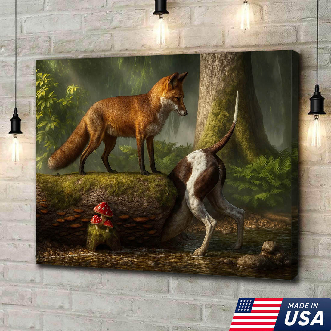 Fox and Hunting Dog Funny Canvas Wall Art – Rustic Wildlife Decor, Woodland Animal Painting, Nature Lodge Artwork
