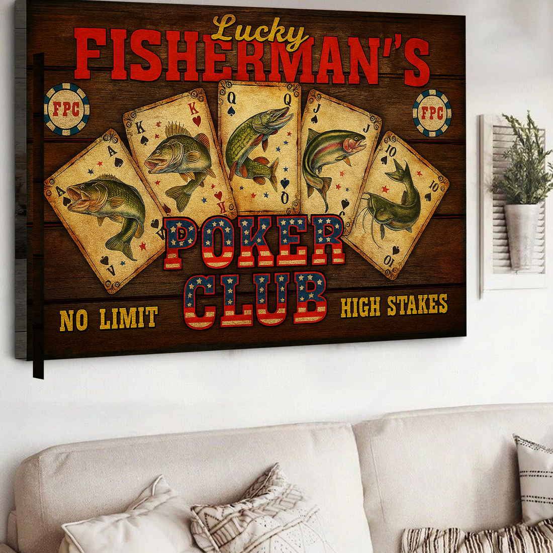 Lucky Fisherman’s Poker Club Wall Art – Vintage Fishing Playing Cards Canvas for Man Cave