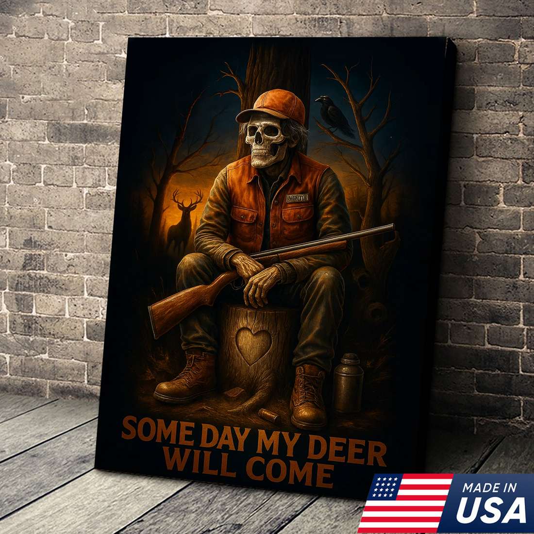 Funny Deer Hunting Canvas Wall Art – Skeleton Hunter with Rifle, Rustic Lodge Decor, “Some Day My Deer Will Come” Artwork