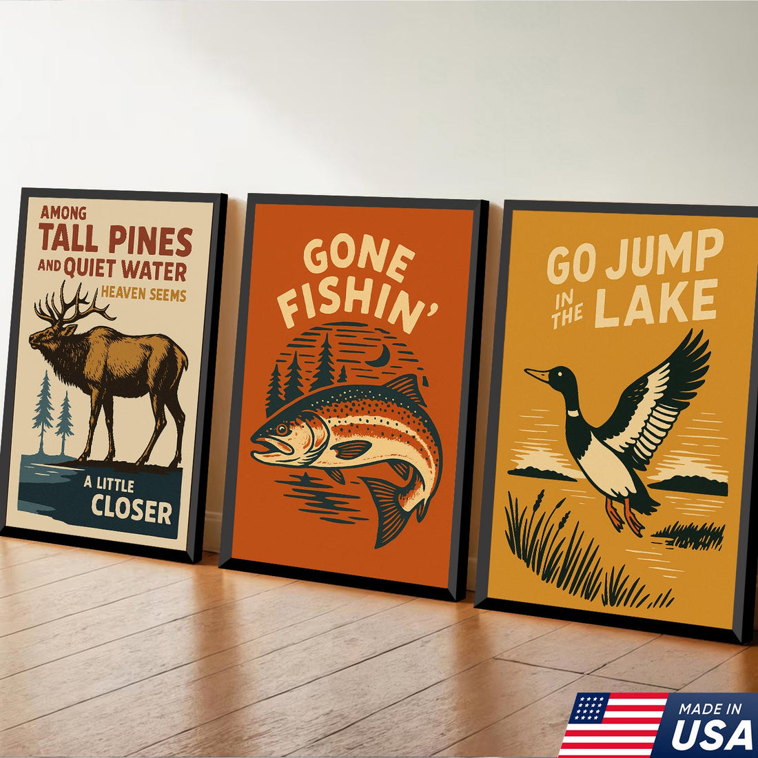 Set Of 3 Vintage Cabin Canvas Wall Art – Elk, Fish & Duck Retro Posters for Lake House & Lodge Decor