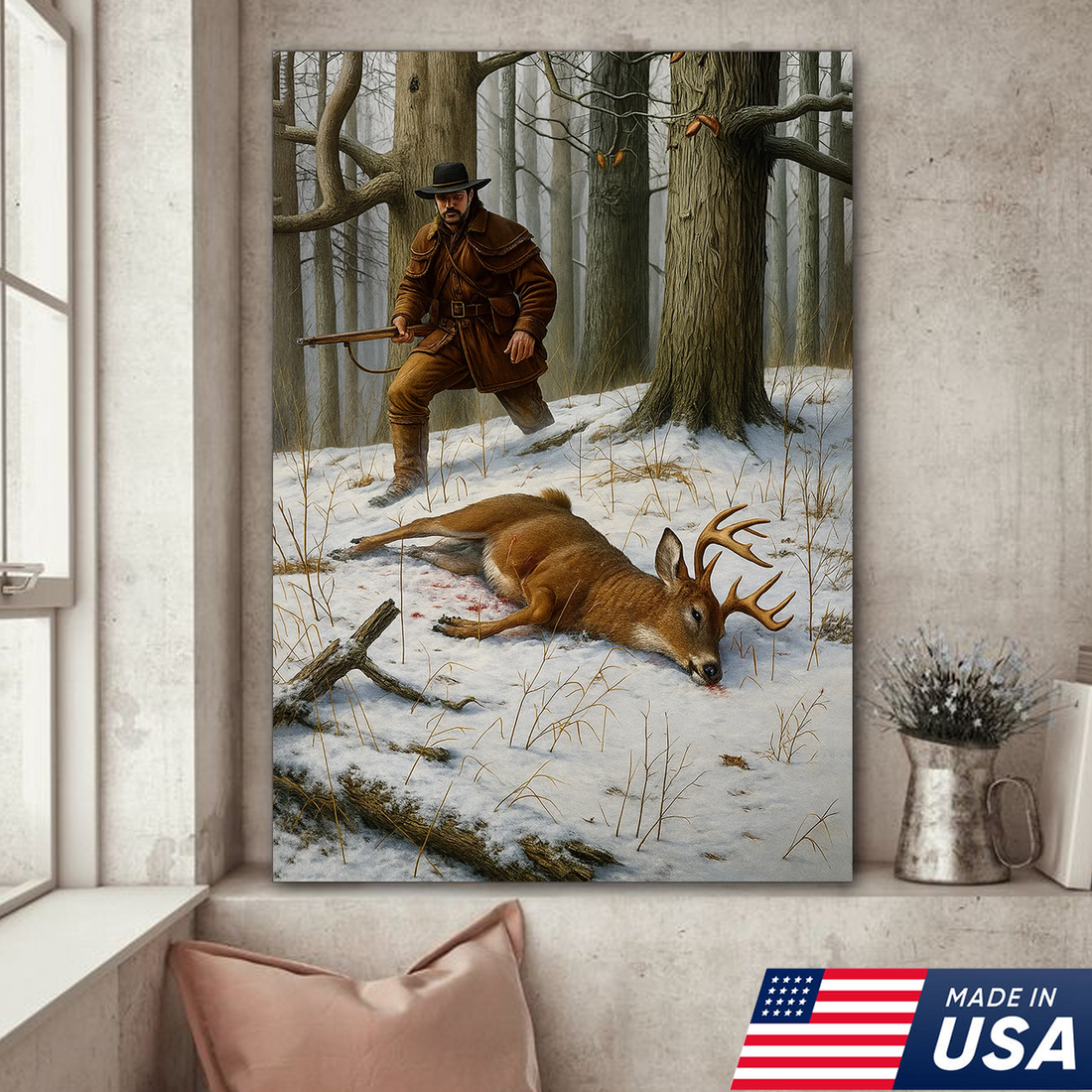 Deer Hunting Canvas Wall Art – Rustic Winter Forest Scene, Hunter with Rifle and Buck, Wildlife Lodge Decor