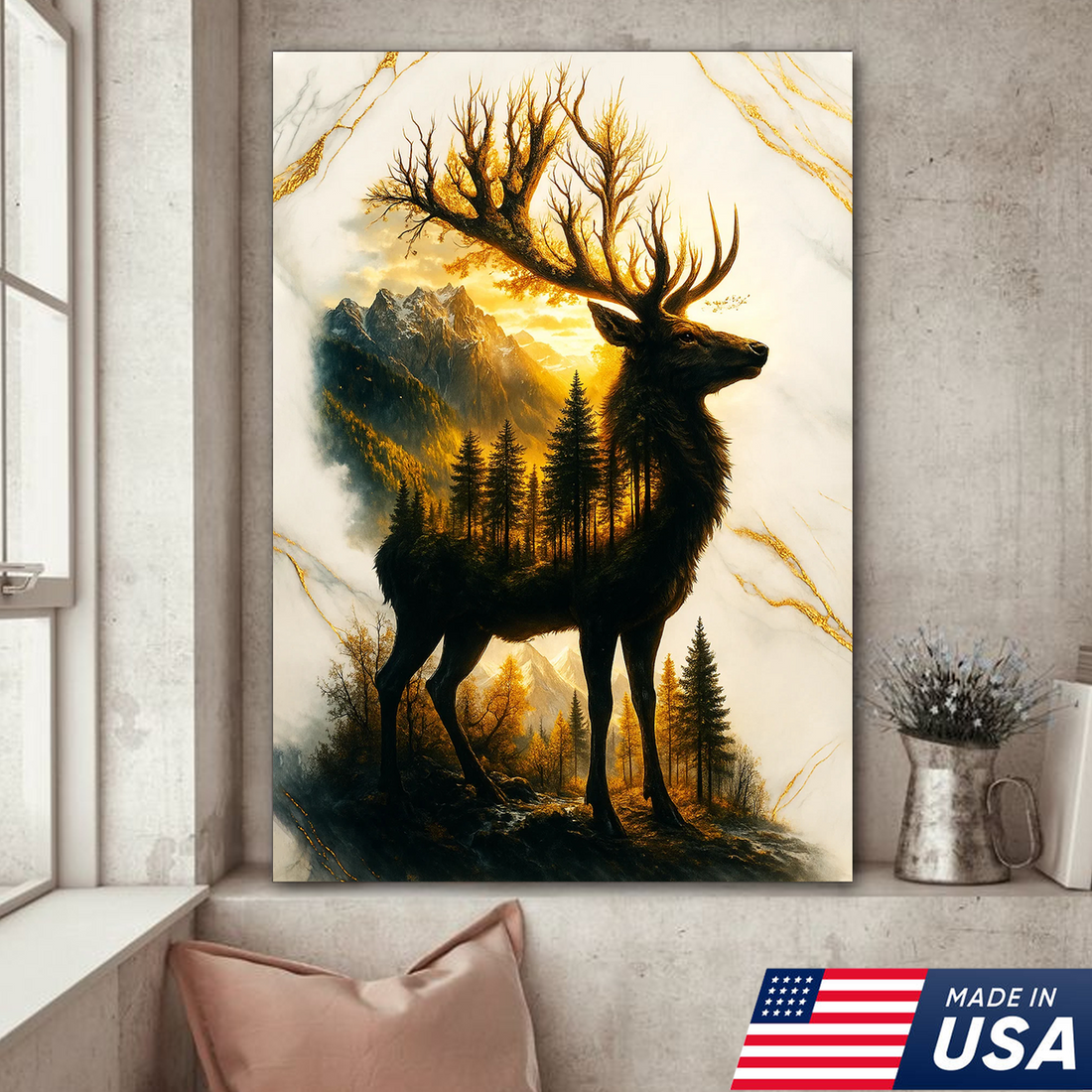 Majestic Deer Canvas Wall Art – Rustic Wildlife Decor, Forest Landscape within Buck Silhouette, Mountain Lodge Artwork