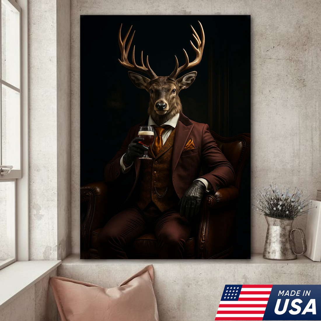 Deer Gentleman Canvas Wall Art – Rustic Lodge Decor, Anthropomorphic Buck in Suit, Whiskey & Cigar Lounge Artwork