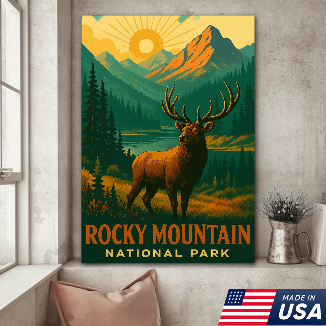 Rocky Mountain Elk Canvas Wall Art – Vintage National Park Poster, Rustic Wildlife Decor, Mountain Lodge Artwork
