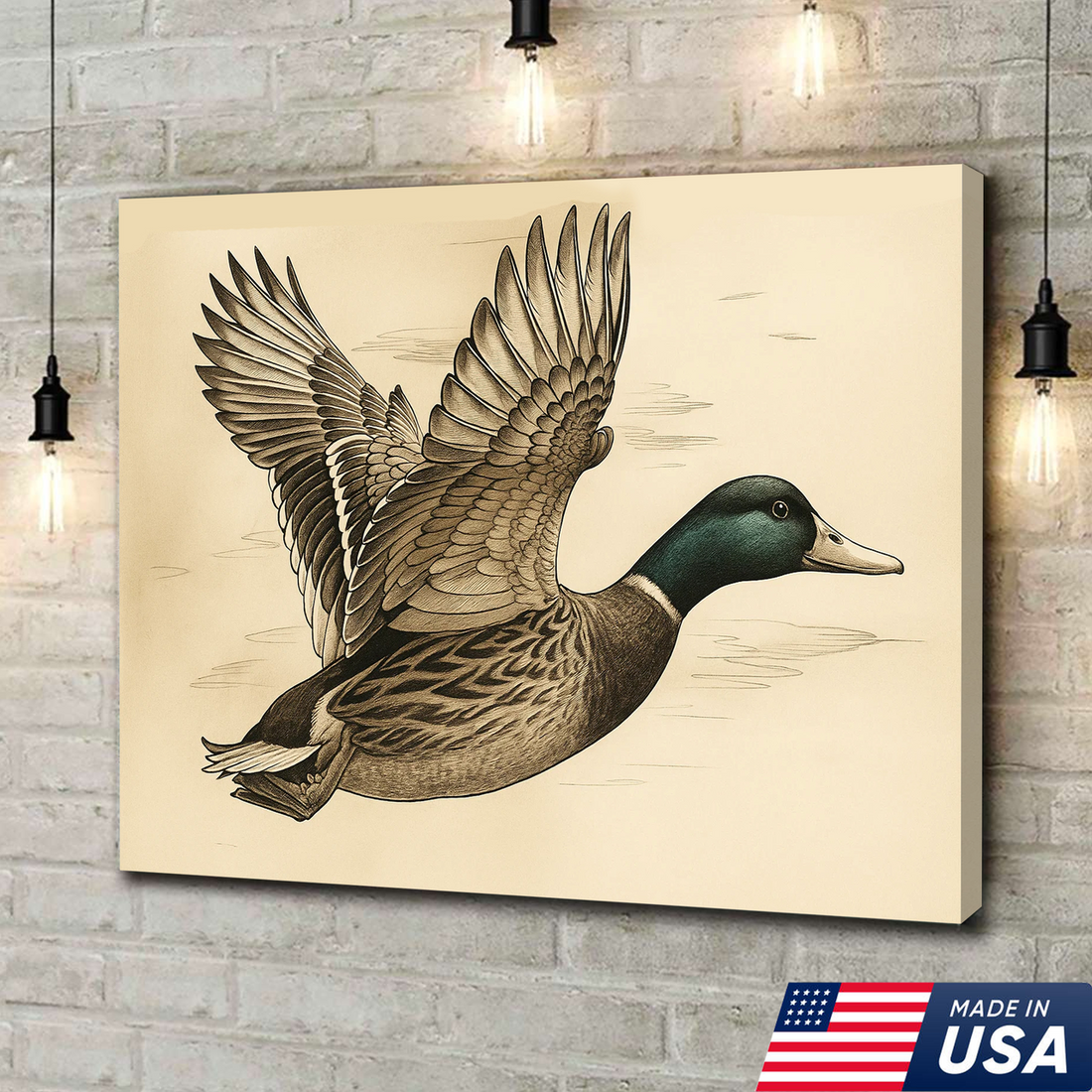 Mallard Duck Canvas Wall Art – Vintage Wildlife Decor, Rustic Hunting Lodge Artwork, Flying Waterfowl Painting