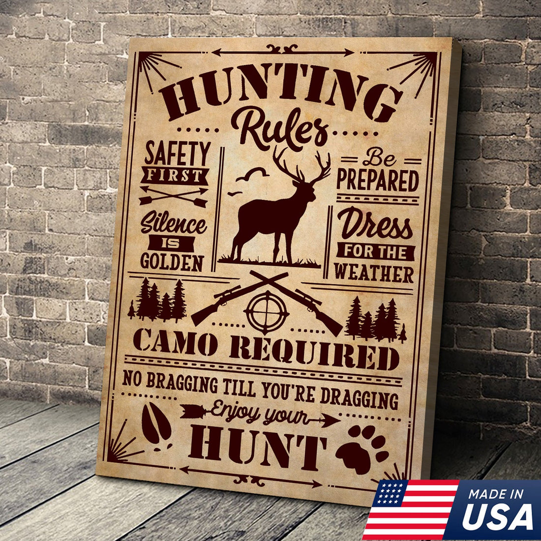 Hunting Rules Wall Art Canvas – Rustic Deer Hunting Lodge Decor – Safety First, Camo Required, Enjoy Your Hunt