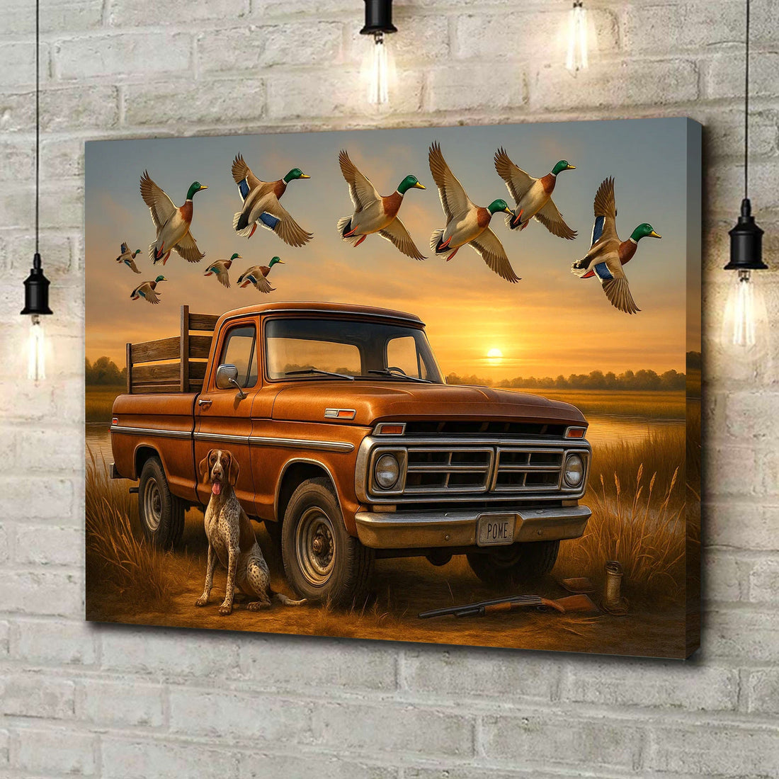 Rustic Hunting Canvas Wall Art – Vintage Pickup Truck with Hunting Dog & Flying Mallard Ducks at Sunset – Lodge Cabin Decor