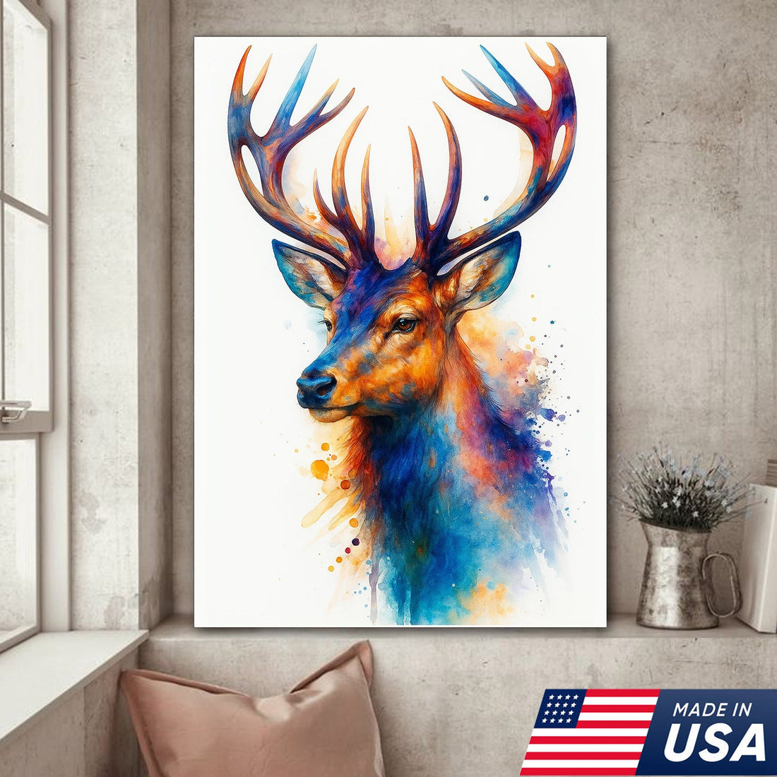 Colorful Deer Canvas Wall Art – Vibrant Watercolor Buck Painting on White Background – Modern Wildlife Artwork for Hunting Lodge & Rustic Cabin Decor