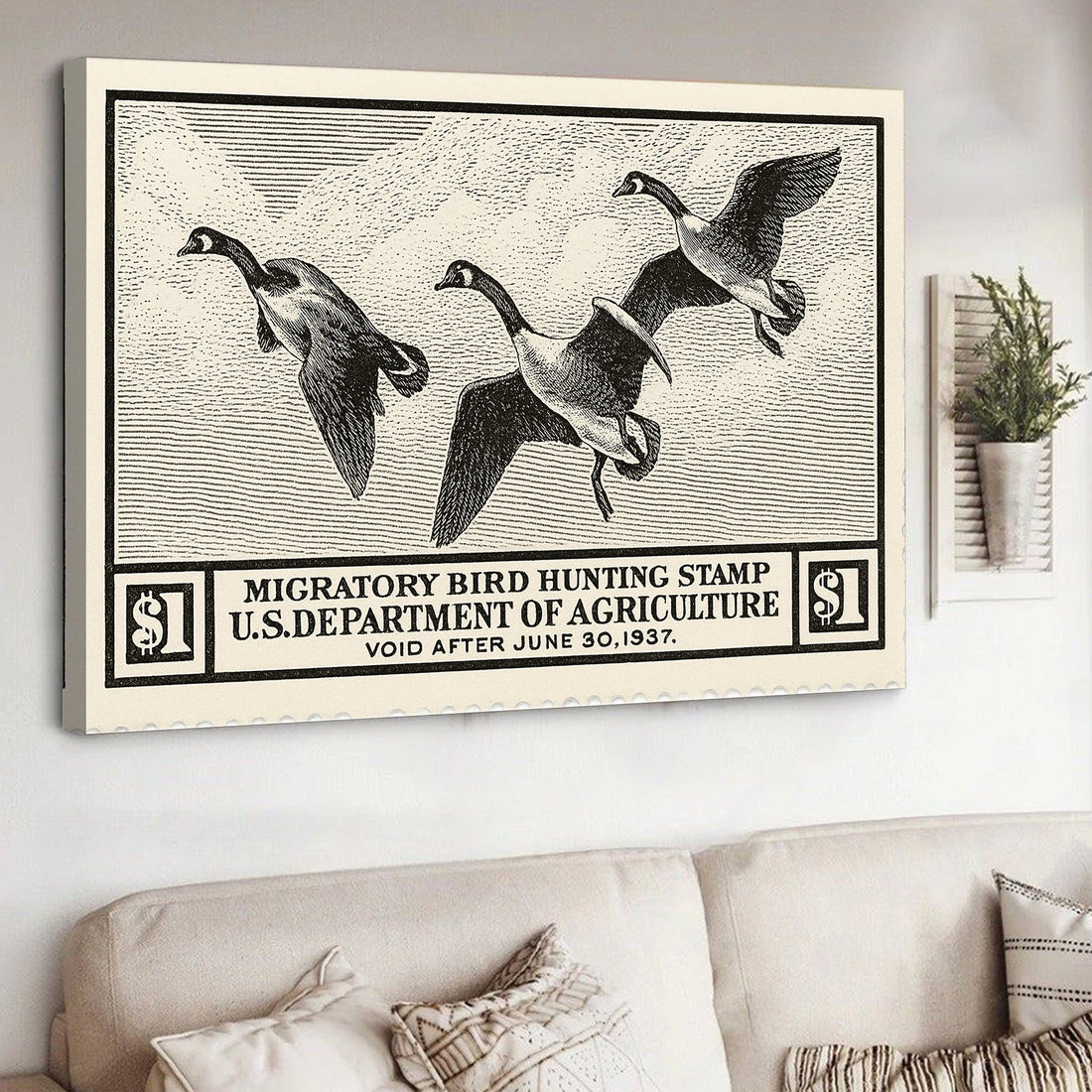 Vintage Migratory Goose Hunting Stamp Wall Art – Retro Duck Print Canvas for Hunters & Cabin Decor
