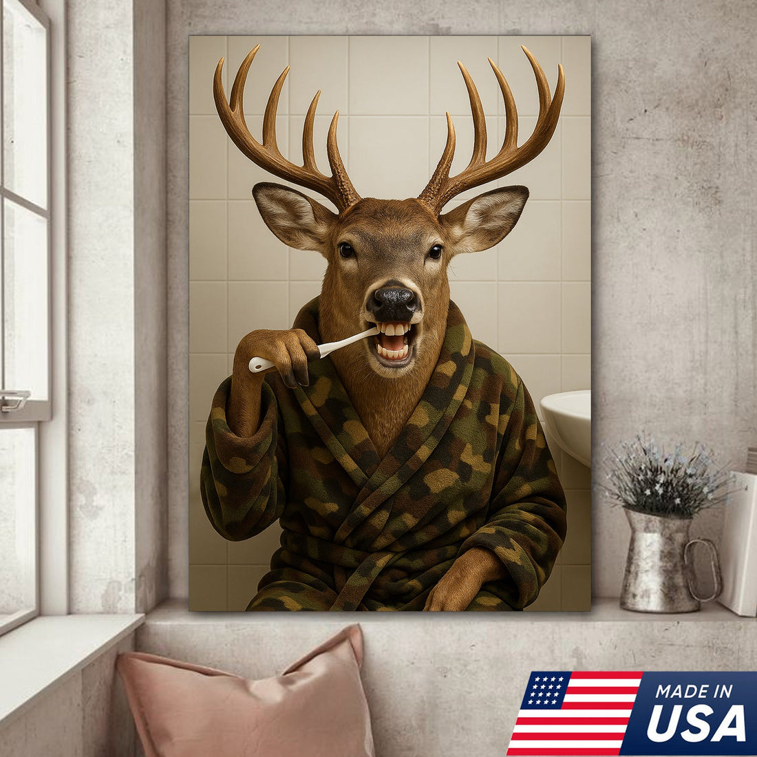 Funny Deer Brushing Teeth Wall Art – Rustic Bathroom Canvas for Cabin, Lodge & Man Cave Decor