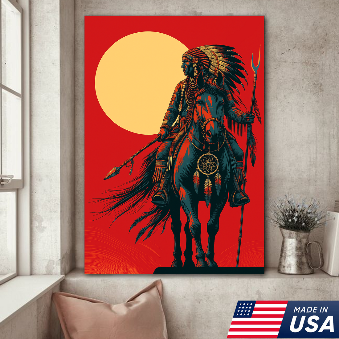 Native American Warrior Canvas Art – Western Rustic Wall Décor Gift for Native American & Cowboys